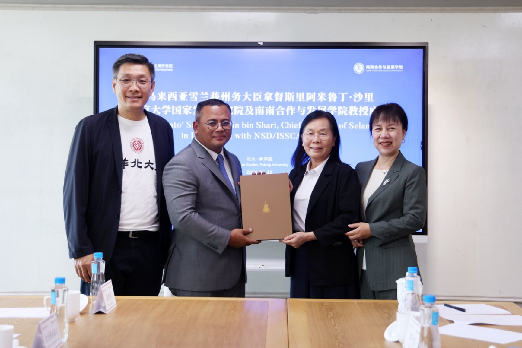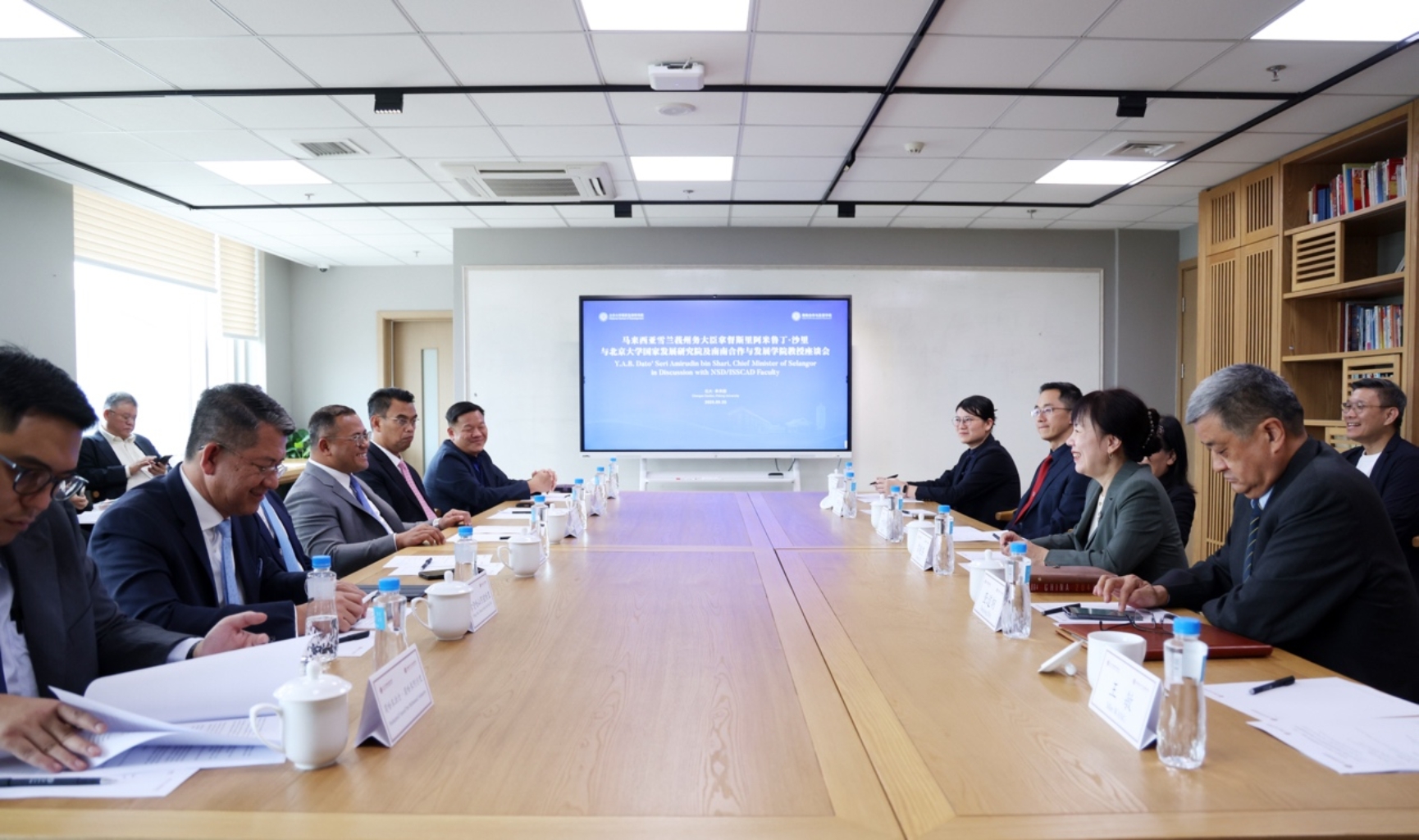 在随后的闭门座谈会上,双方就深化合作展开了讨论。雷晓燕教授对代表团的来访表示欢迎,并介绍了国发院作为国家高端智库和促进南南合作重要平台的发展历程与使命。阿米鲁丁首席部长将雪兰莪州誉为“马来西亚的心跳”,强调其作为国家经济引擎和高等教育中心的突出地位。他特别表示,雪州政府正积极计划设立专项奖学金,选派本州优秀学生与政府官员前来北大深造,以提升公共治理能力和推动产业升级。
